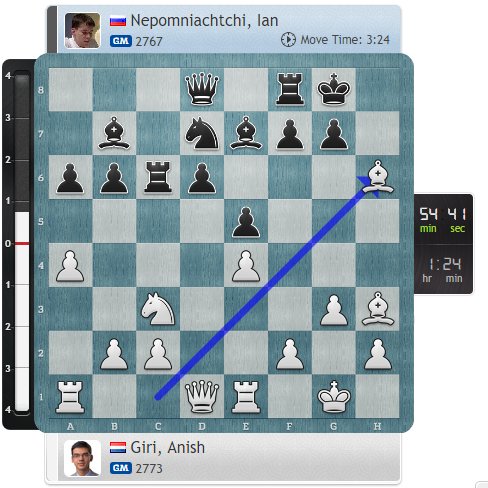 - Aniš Giri je prekinuo niz od 14 remija zaredom pobedom protiv Nepomnijačija (koji ima jako loš turnir) kada je njegov rival propustio dve slične taktike na meču